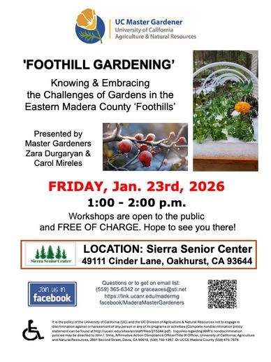 Gardening in the foothills comes with unique challenges—and unique rewards! Join us for an informative, beginner-friendly workshop on Foothill Gardening, where local Master Gardeners will share tips, insights, and practical advice for growing successfully in the Eastern Madera County foothills.