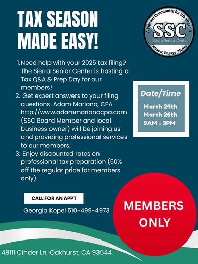 Need help with your 2025 tax filing? The Sierra Senior Center is hosting a special Tax Q&A & Prep Day just for members! Get expert answers to your tax questions and take advantage of discounted professional tax preparation services.